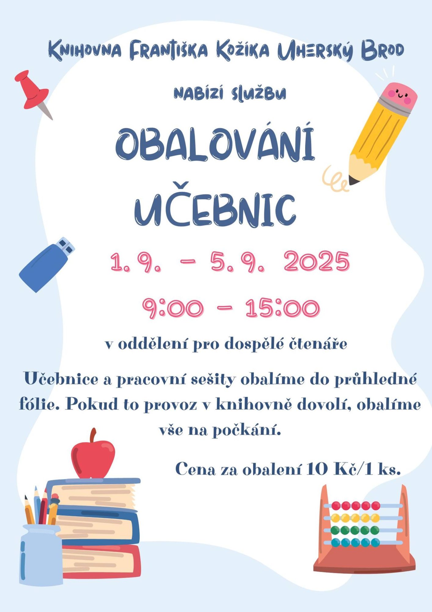 Obalování učebnic a pracovních sešitů bude probíhat od 1. 9. do 5. 9. v čase od 9:00 do 15:00 v Knihovně Františka Kožíka – oddělení pro dospělé čtenáře.
