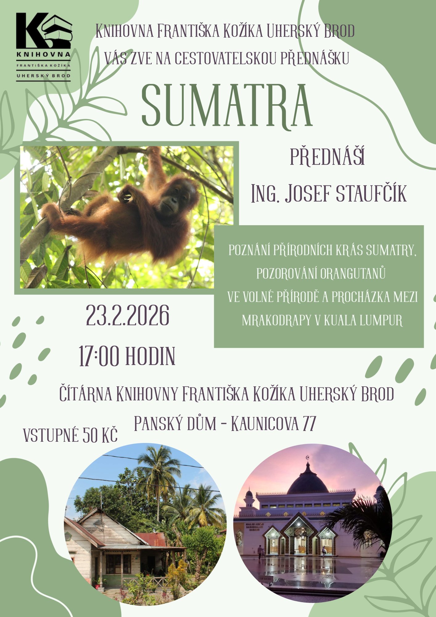 Knihovna Františka Kožíka Uherský Brod vás zve na cestovatelskou přednášku s panem Ing. Josefem Staufčíkem  - Sumatra. Máte rádi orangutany? Chcete je vidět v pralese, v jejich přirozeném prostředí? Jsou to jiní tvorové, než jak znáte lenivé, apatické ze zajetí zoologických zahrad. Nejen za nimi se v této přednášce vypravíme na Sumatru do volné přírody. Příroda na Sumatře je nádherná. Bohužel pralesy jsou zde neustále se káceny, vypalovány a nahrazují je plantážemi palmy olejné. Místní nádherné a vzácné druhy zvířat tak přicházejí o své domovy. Budeme se tedy věnovat nejen orangutanům, ale i ostatní přírodě, domorodému obyvatelstvu. Závěrem se stavíme na malou návštěvu města Kuala Lumpur.