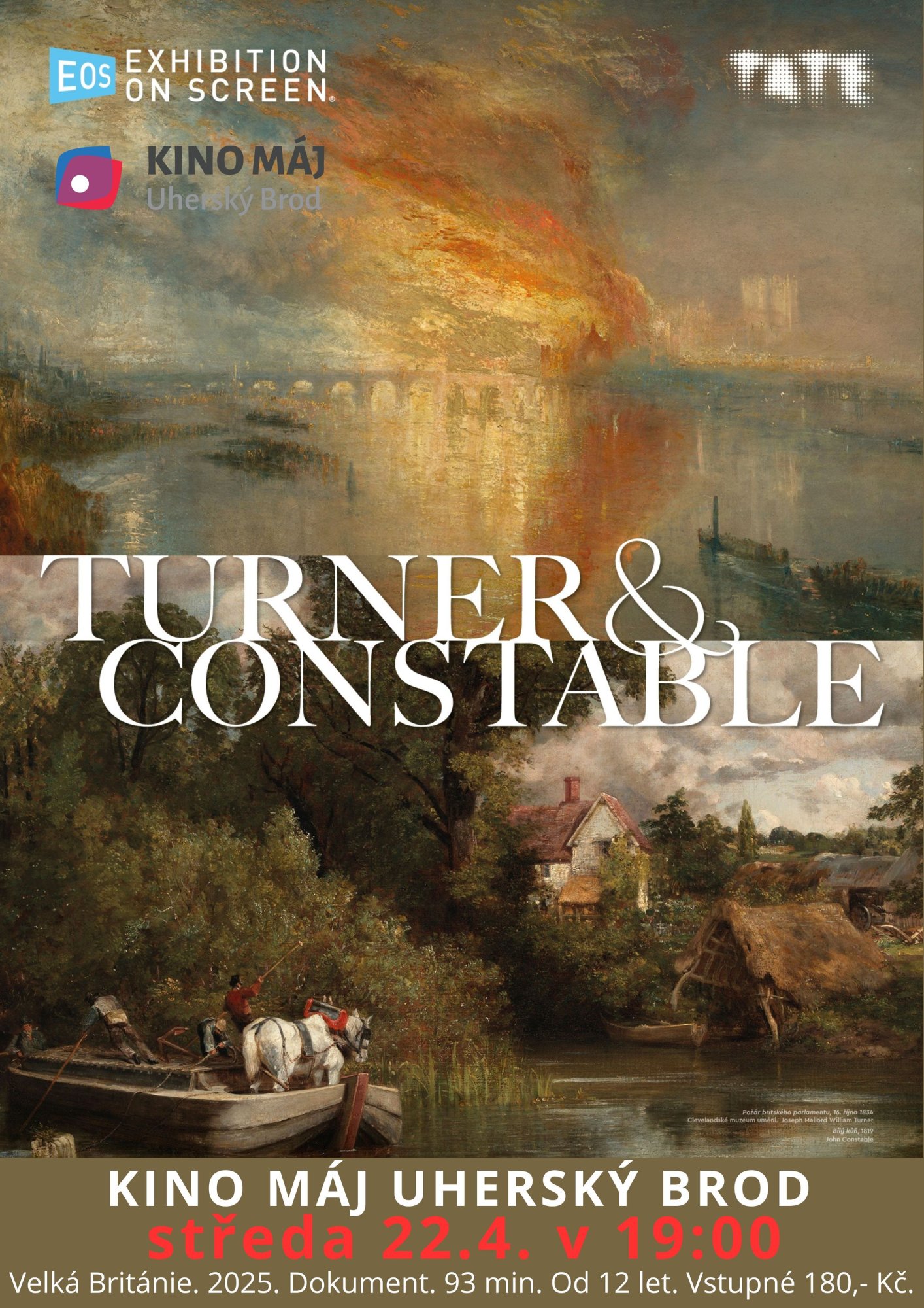 Turnerovy planoucí západy slunce a úchvatné výjevy z cest i Constableova idealizovaná zobrazení milovaných míst domova kdysi vyvolaly mezi veřejností bouři nadšení. Constable představuje to nejlepší z tradičního realismu a venkovské nostalgie, zatímco Turner přináší vzrušující nový způsob, jak zachytit emoce a snové dojmy. Kritici jejich výrazně odlišné styly přirovnávali ke střetu „ohně a vody“. Nenechte si ujít jedinečnou příležitost vidět tyto dva velikány poprvé vedle sebe na velkém plátně – tak jako se vedle sebe často ocitali i za svého života.